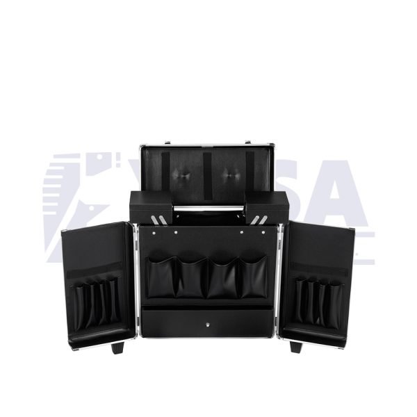 Puertas y múltiples compartimentos para almacenar, organizar o transportar peines, tijeras, cepillos, cortaúñas, botellas, aerosoles, rasuradoras, cuchillas y más.