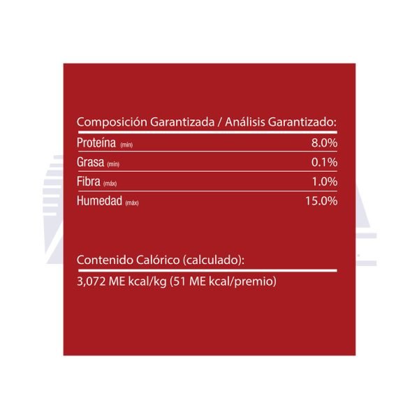 Almidón de maíz, carne de pollo, sorbitol, glicerina, chícharos/arvejas deshidratadas, gelatina de cerdo, fructosa, maltodextrinas, jarabe de malta, suero de leche bovino fermentado, sal, carragenina, zanahoria deshidratada, camote deshidratado, fosfato di cálcico, pirofosfato de sodio, tripolifosfáto de sodio, vitamina E, pantotenato di cálcico, hidrocloruro de tiamina, sulfato férrico, hidrocloruro de piridoxina, niacinamida, color rojo carmín natural, sulfato de manganeso, sulfato de Zinc, vitamina B12, riboflavina.